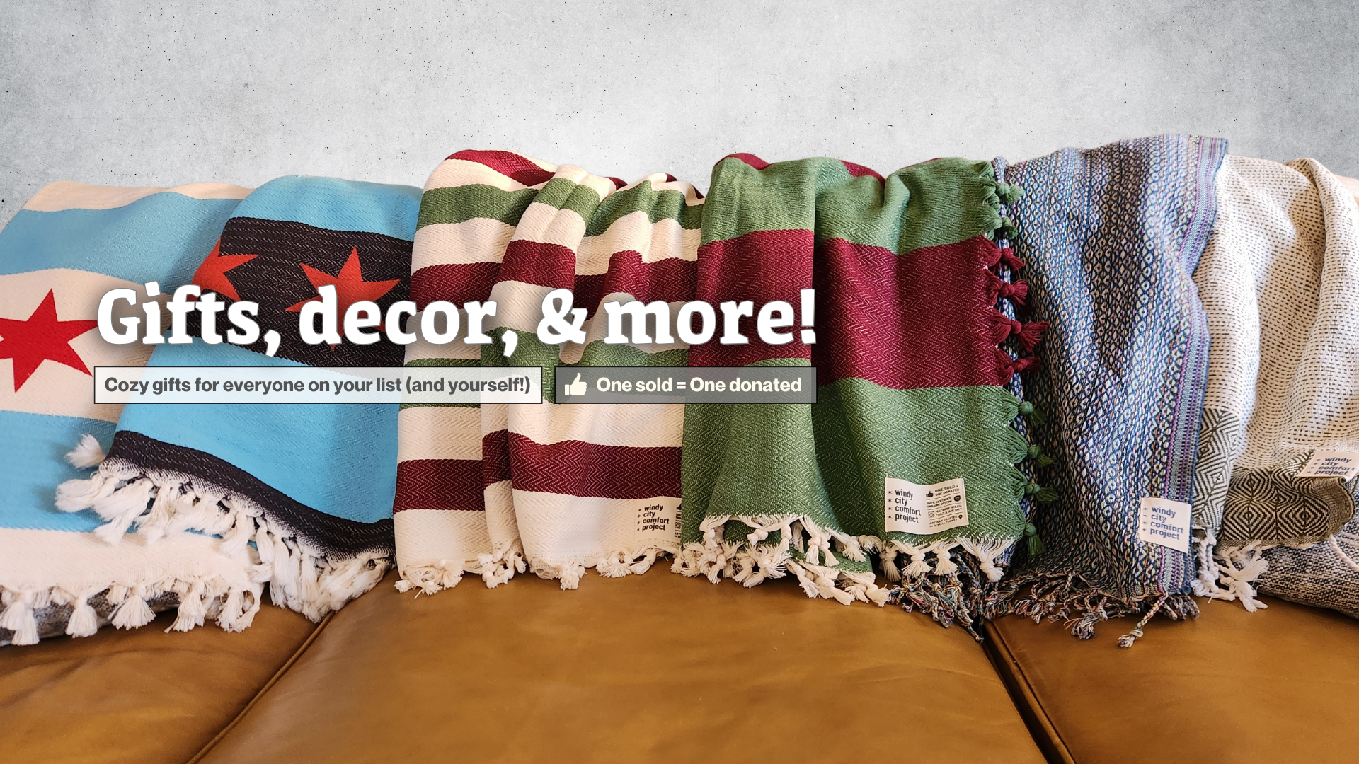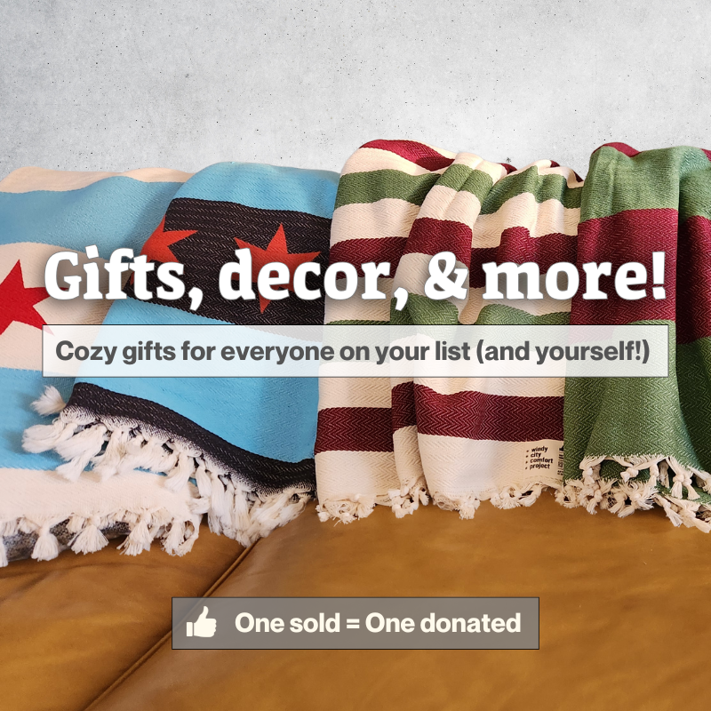 We're proud to partner with organizations like Chicago's A Safe Haven and Family Shelter Services, committed to restoring lives to self-sufficiency. For every blanket sold, one is donated to help our neighbors in need. For events away from our home market, we partner with local organizations to donate within the community. To date, we've proudly helped amplify the work of nearly a dozen organizations throughout IL, WI, MN, FL, and CA.